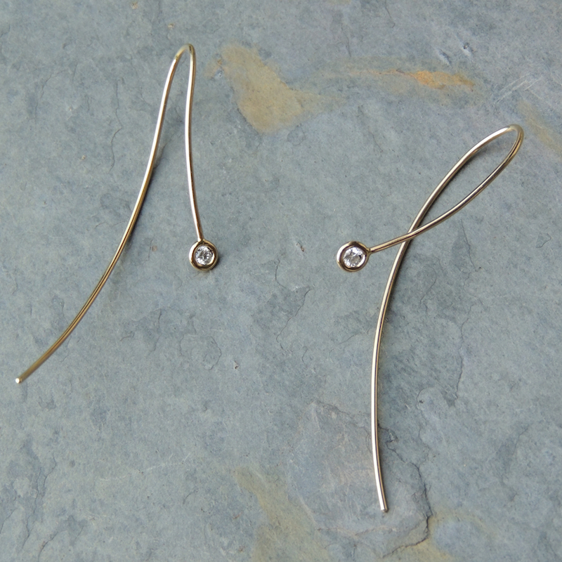 A long elegant sweep of wire flows from the diamond up through the front of the ear lobe and down the back, silhouetting the neckline with the diamond suspended front and center. The handmade earrings have a length of 2 5/8”.Handmade hardened wire earrings are available in 14k yellow, white, or rose gold.