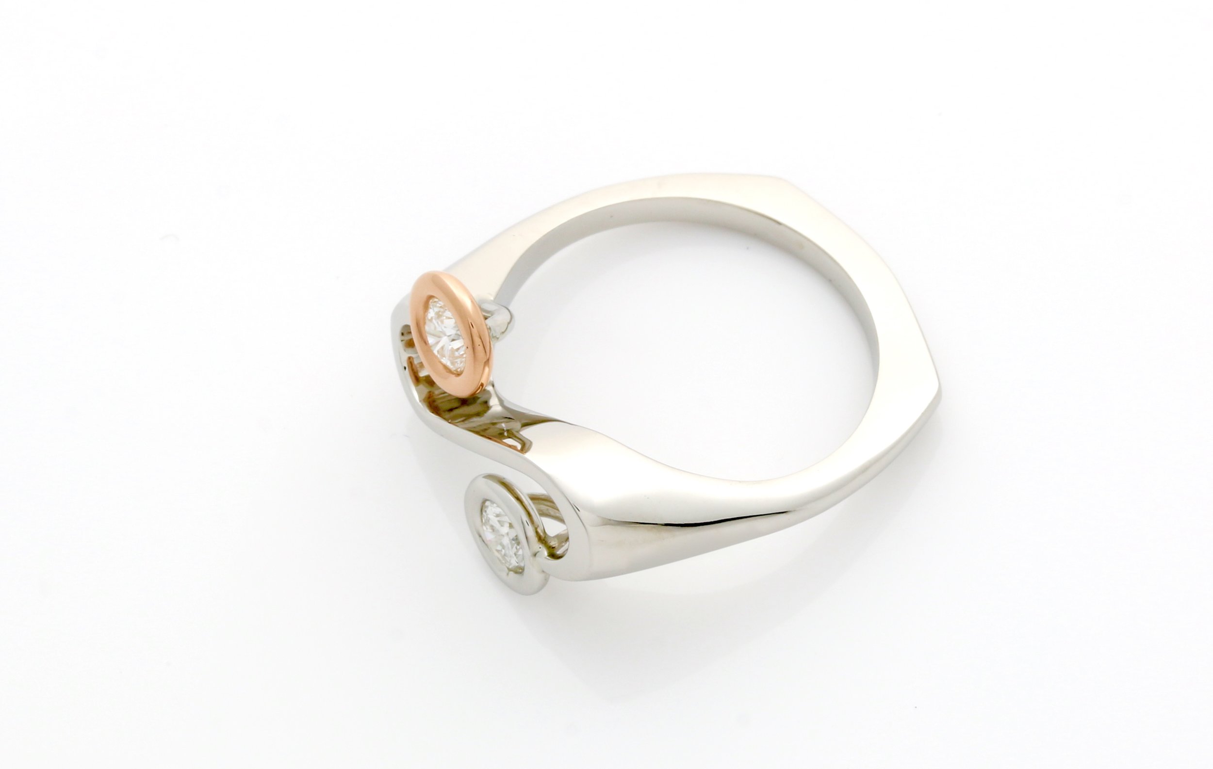 The Threesome Diamond Ring is a classic look in a clean design. The handmade ring is set with one 15 point and two 10 point diamonds Available in 14k rose, yellow or white gold.