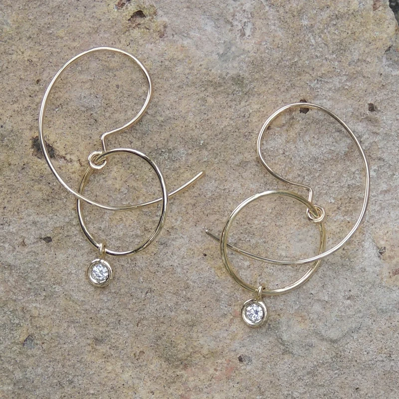 Similar in design to the Trapeze Me Forward Diamond Earring, the Trapeze Me Reverse Diamond Earring flows through the ear from back to front. Elegant and playful, A sweeping, curved wire flows through a hinged, floating circle with a diamond dangling from a closed loop on the circle of each earring. The handmade earrings have a length of 1 7/8”. Handmade hardened wire earrings are available in 14k yellow, white, or rose gold.