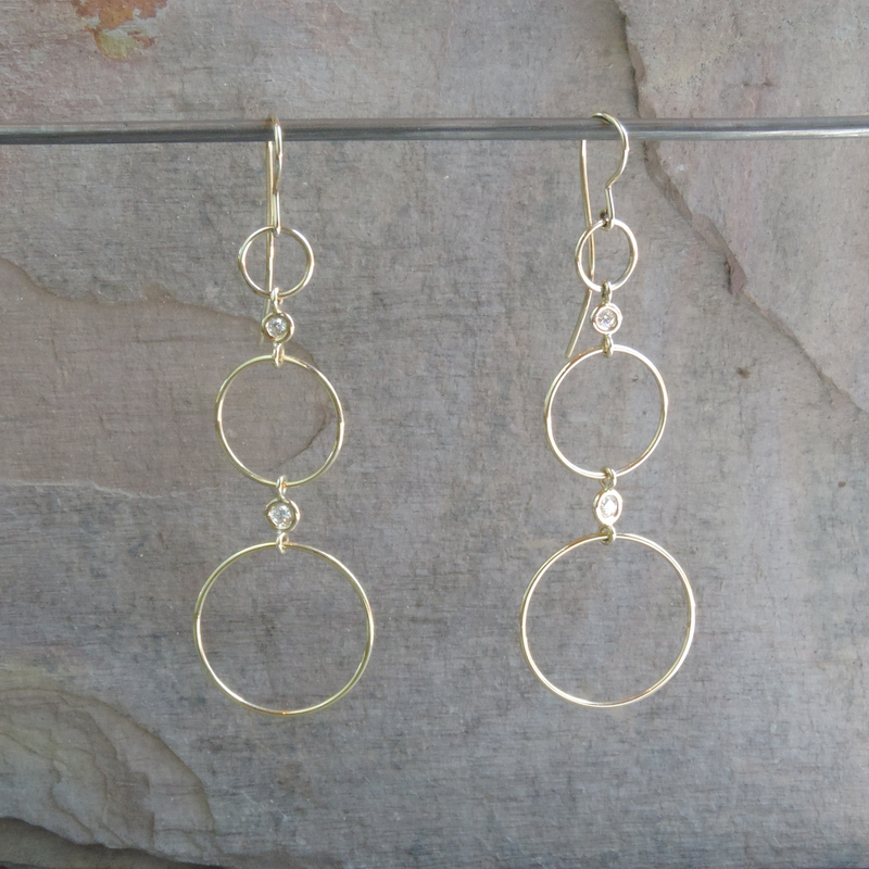 Perfect circles cascade down from handmade french ear wires. Diamonds connect the circles from closed loops. The Triple Moon Diamond earring has two diamonds connecting three circles. The earrings have a length of 3 1/4”. Handmade hardened wire earrings are available in 14k yellow, white, or rose gold.