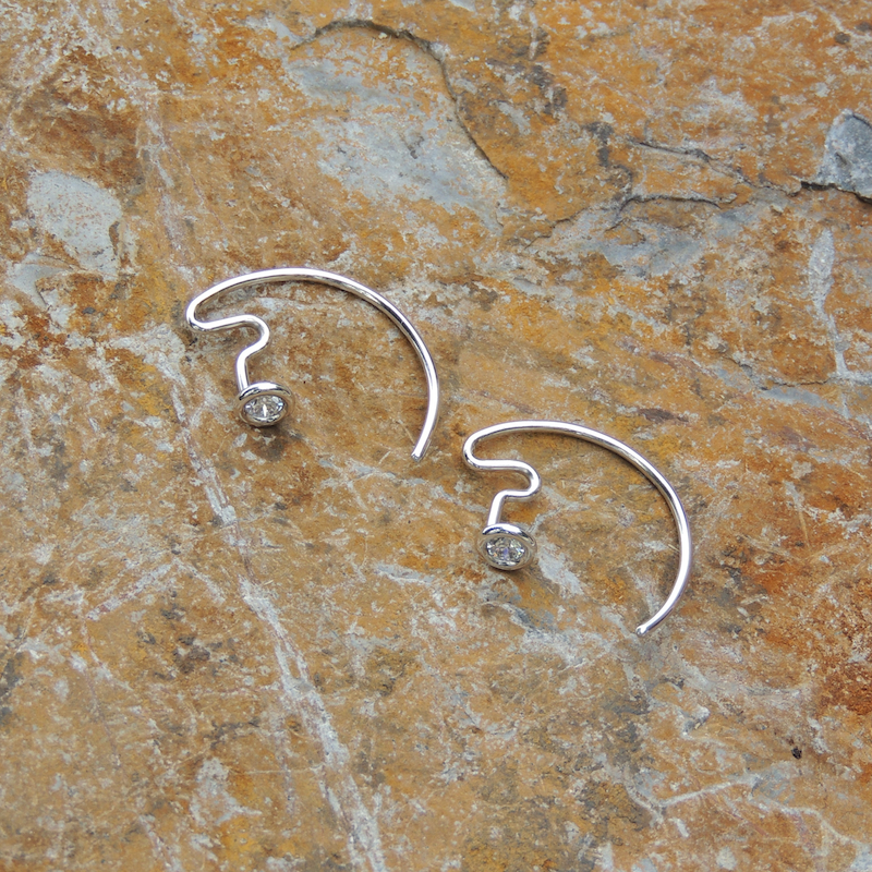 A cool spin on the classic diamond stud. No need for an earring back, the hills and valleys of the wire hold the diamond securely in place against the ear lobe. The tail curves down and out below the stud adding a sweet sweep to the glistening diamond earring. The earrings have an outside diameter of 1”. Handmade hardened wire earrings are available in 14k yellow, white, or rose gold.