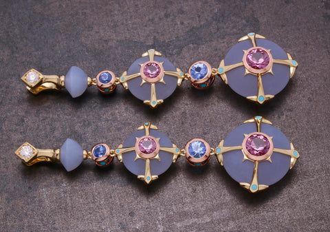 Handmade in 18k yellow and rose gold. Perfect hand carved discs of Turkish blue Chalcedony crowned with stunning Malaya Garnets bezel set in rose gold. Adorned with Turquoise trimmed yellow gold straps. Cascading down with connections of bezel set Sapphires and finished on Diamond, Chalcedony and Turquoise huggies.