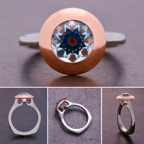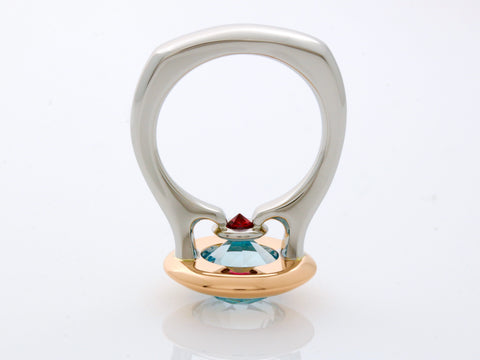 Our Kaleidoscope design begins with an extraordinary old European cut 3.74 carat Malawi Aquamarine, set to perfection in our handmade 18k rose gold disc bezel and suspended on our hand carved platinum band. The finishing touch of a .241 carat vibrant red ruby, precision set just below the culet, creates a stunning kaleidoscope tapestry from above. The Kaleidoscope Solitaire is a beautiful mashup of old world design and modern minimalist architecture.